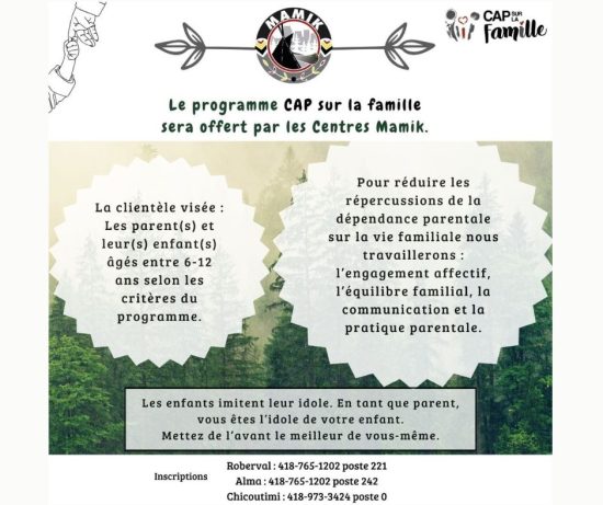Cap sur la famille est un programme offert par le Centre Mamik qui vise l’entraînement aux habiletés parentales. Il est conçu spécifiquement pour les familles qui comprennent des enfants âgés de 6 à 12 ans, où au moins un parent fait face à une dépendance à l’alcool ou aux drogues. Ce programme se distingue par son focus sur les familles touchées par la dépendance.