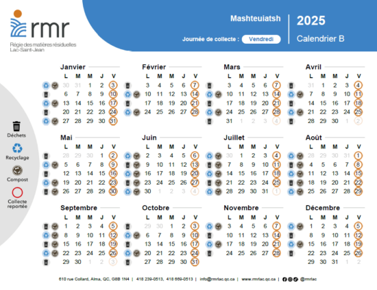 Voici le calendrier des collectes 2025 pour le secteur de Mashteuiatsh.